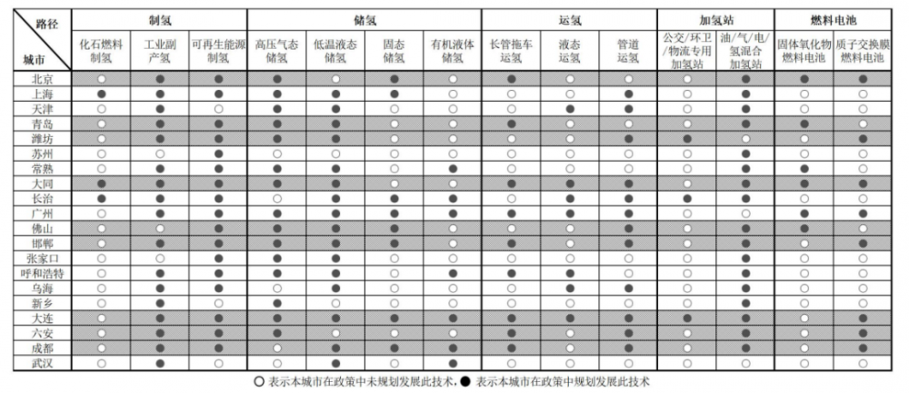 总体上,不同城市在氢能产业链路径的选择上存在差异,氢能路径选择呈多元发展形态,例如:北京、上海在氢能产业链多阶段均选取多元发展路径,但方案的选择存在显著差别,运氢阶段上,上海选择管道运输技术,北京更侧重于长管拖车技术。