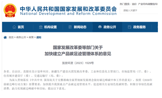 国家发展改革委等五部门联合印发《关于加快建立产品碳足迹管理体系的意见》