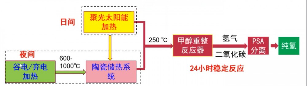 “太阳能光热甲醇制氢技术具有成本低、安装简单、氢气纯度高、储能方便等优点。”佛山仙湖实验室冷光辉教授介绍,该项技术利用太阳能集热技术结合低谷电加热和陶瓷储热技术,将热能稳定地通过导热油供给甲醇重整制氢反应器制氢,再经过提纯和PSA变压吸附将氢气纯度提高到99.999%。据测算,项目制氢综合成本低于25元/kg,最终加氢成本低于35元/kg。