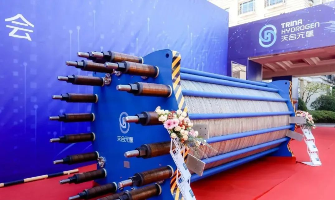 2022年12月19日,天合元氢首台套碱性电解水制氢设备正式下线,该设备产氢量为1000Nm3/h,可以有效解决新能源弃电问题。