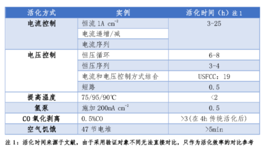 上述的在线活化方法可以显著提高燃料电池的性能,通过特定的顺序组合技术还可以进一步加快活化时间。其中传统的电流控制和电压控制两种活化方式,主要是满足实验室的场景需求,活化时间长,同时氢气消耗量较大。