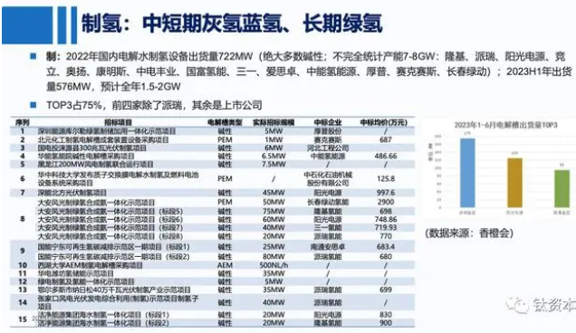 另一种方法是电解水制氢,已经取得了一些进展。目前,总产能已经达到了7-8GW。然而,碱性电解槽无法与风能光能相结合,而PEM电解槽在这方面更有优势。但成本较高,如上半年招标的项目所示,碱性电解槽的成本基本上在每兆瓦30万元左右。今年上半年的出货量已经达到576兆瓦,去年全年达到722兆瓦,预计全年总量将达到约1.5GW。