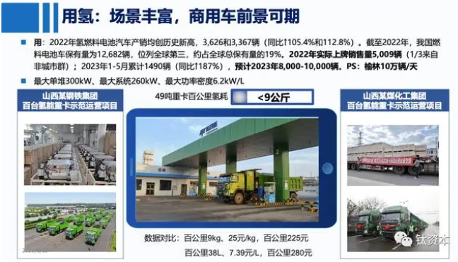 氢能源产业链非常长,包括生产、储存、运输和使用等环节,我们主要关注氢能商用车,特别是大型重型卡车。因为一辆49吨的重型卡车,其排放相当于大约200辆乘用车。但实际上,我们的定位是减排和应对双碳目标。尤其在北方,许多煤化工、焦化工、钢铁等重工业企业,需要大量的氢气来减少排放。