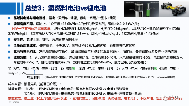 也许有人一直在将氢能源与锂电池进行比较。首先,要明确,锂电池和氢能在定位和用途上存在不同。其次,就能量密度而言,以相同的体积来看,氢气的能量密度比锂电更高。再次,关于全生命周期成本和能量效率。如果将电能从电网传输到电池再传输到车轮,这个效率大约为27%。但如果使用煤制氢,然后将氢压缩、储存、传输到电堆再传输到车轮,效率大约为29%。然而,如果不经过煤制氢的过程,效率可能只有10%左右,氢能源的发展中,储能在工业应用中扮演着重要角色,我们需要将多余的电能储存起来,这不仅仅是为了供车辆使用。所以,我们需要宏观地看待整个产业链的效率问题。