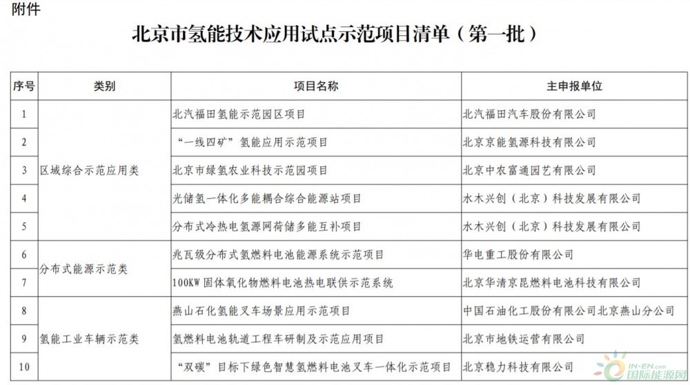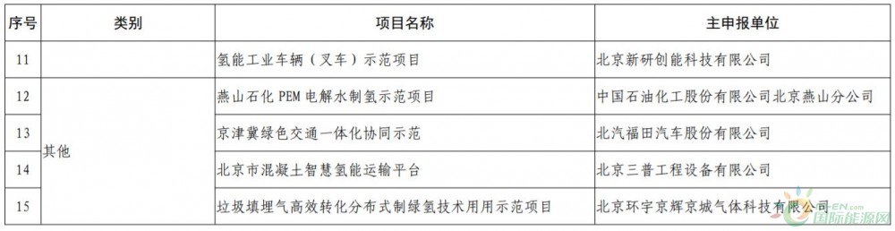 7月27日,北京市经济和信息化局公布《北京市氢能技术应用试点示范项目清单(第一批)》,第一批为区域综合示范应用类、分布式能源示范类、氢能工业车辆示范类及其他四大类别共15个项目上榜。