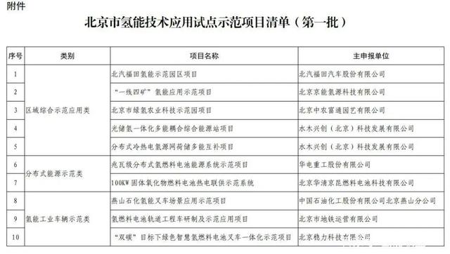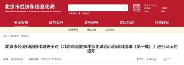 7月27日,北京市经济和信息化局对《北京市氢能技术应用试点示范项目清单(第一批)》进行公示,区域综合示范应用类、分布式能源示范类、氢能工业车辆示范类及其他类共15个项目上榜。