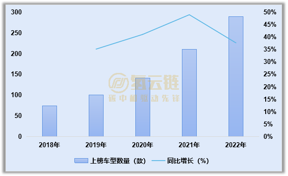 图表1 2018-2022年推荐目录燃料电池汽车车型上榜情况(单位:款,%)