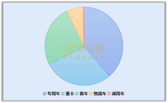 其中专用车占比再度登顶,占比达38.8%;“市场明星”重卡产品占比达到28.7%,仅次于专用车,排名第二;客车、物流车和乘用车占比分别为25.3%、6.9%和0.3%。