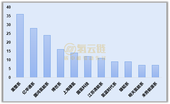 备注:重塑系包括上海重塑能源科技有限公司、浙江重塑能源科技有限公司、郑州重塑能源科技有限公司、陕西大秦重塑能源科技有限公司、天津渤海重塑能源科技有限公司;国鸿氢能系广东鸿力氢动科技有限公司、美锦国鸿(浙江)氢能科技有限公司、上海鸿芯氢能科技有限公司、北京鸿力氢动科技有限公司、鄂尔多斯市国鸿氢能科技有限公司、河南国鸿氢能科技有限公司、天津国鸿氢能科技有限公司;亿华通系包括北京亿华通科技股份有限公司、亿华通动力科技有限公司、北京聚兴华通氢能科技有限公司、山东华清动力科技有限公司;博世系包括博世汽车系统有限公司、博世氢动力系统(重庆)有限公司;江苏清能系包括广东清能新能源技术有限公司、上海清志新能源技术有限公司;氢蓝时代系包括河北氢沃科技有限公司、深圳市氢蓝时代动力科技有限公司;雄韬系包括深圳氢瑞燃料电池科技有限公司、武汉雄韬氢雄燃料电池科技有限公司;明天氢能系包括安徽明天氢能科技股份有限公司、重庆明天氢能科技有限公司、北京明天氢能科技有限公司;未势能源系包括未势能源科技河北有限公司、未势能源科技有限公司保定分公司、上海燃料电池汽车动力系统有限公司。