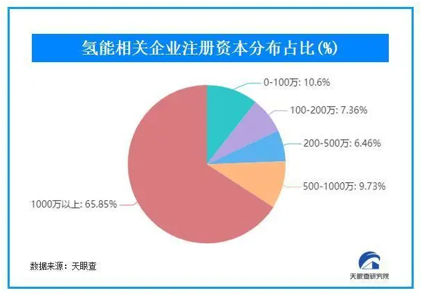从企业注册资本来看,注册资本在1000万以上的相关企业占比超过20.3%,注册资本在0-100万之间的相关企业占比约32.4%。而在氢能源相关企业领域,注册资本在1000万以上的相关企业占比达到65.85%,其发展动能和企业参与积极程度可见一斑。