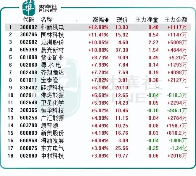 个股中,龙洲股份、晨光新材涨停,科新机电、国林科技均大涨超11%,紫金矿业、粤水电、广汇能源、美联新材等多只概念股跟涨。
