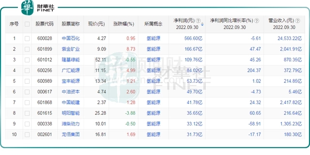 例如,以下根据同花顺提供的氢能源板块提供的成分股业绩进行分析,在年内业绩盈利排名中,拥有氢能一体化的中国石化,主营收入并非氢能,而是石油相关的产品。