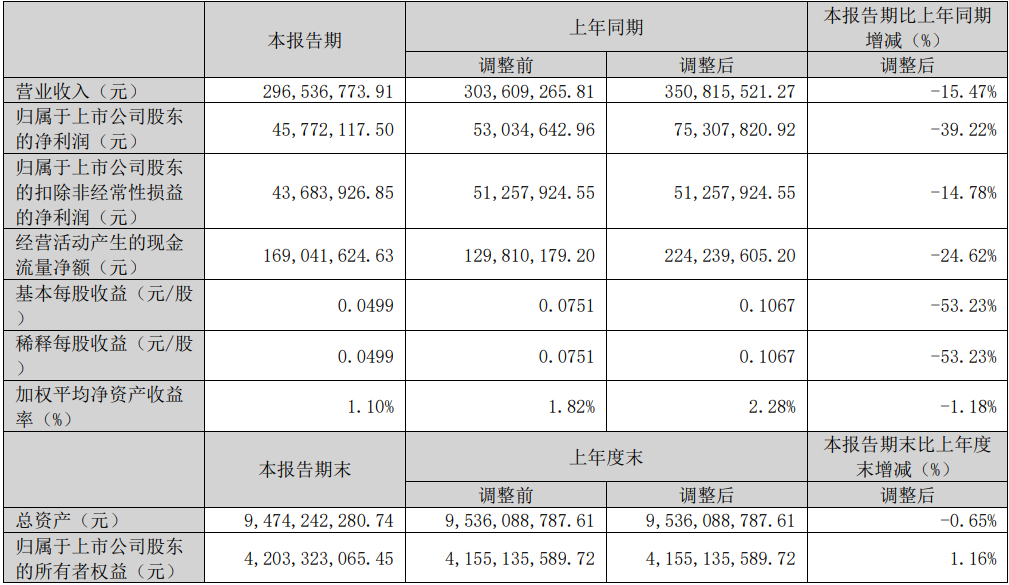 2024年第一季度,公司实现营业总收入2.97亿元,同比下降15.47%;归母净利润4577.21万元,同比下降39.22%;扣非净利润4368.39万元,同比下降14.78%;经营活动产生的现金流量净额为1.69亿元,同比下降24.62%;基本每股收益为0.0499元/股。