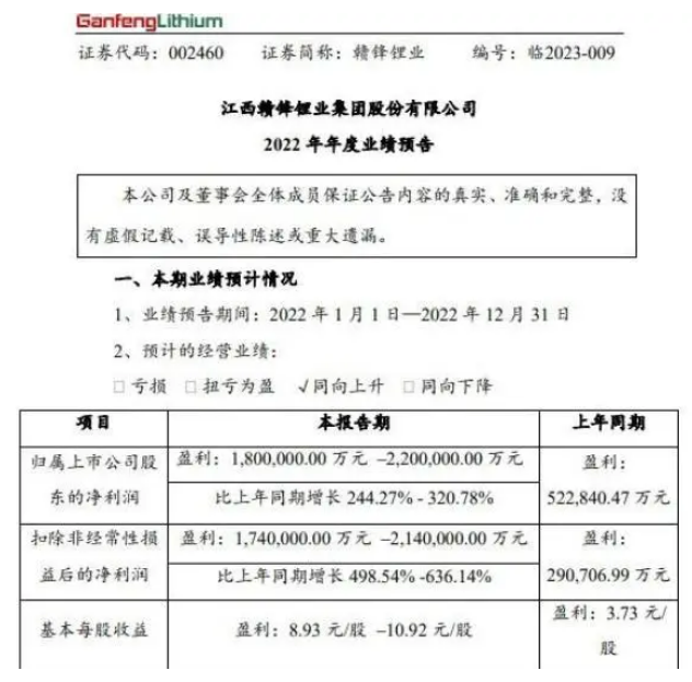 2023年1月29日晚间,国内锂矿巨头赣锋锂业发布公告称,公司预计2022年实现归属上市股东的净利润180亿-220亿元,同比增长244.27%-320.78%。扣除非经常性损益后的净利润为174亿—214亿元,同比增长498.54%—636.14%。