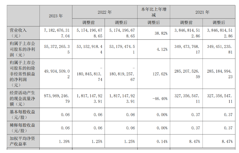 报告披露,2023年,润邦股份实现营业收入718267.63万元,同比增长38.82%;实现归属于上市公司股东的净利润5537.23万元,同比增长4.12%;实现归属于上市公司股东的扣除非经常性损益的净利润4993.45万元,同比增长127.62%。
