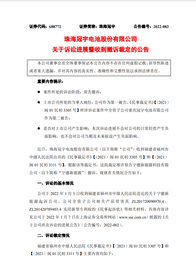 根据裁定书显示,2022年1月5日,珠海冠宇收到福建省福州市中级人民法院送达的关于宁德新能源起诉公司、公司全资子公司相关产品侵害其ZL201720090970.4、ZL201420789403.4实用新型专利权的《民事起诉状》等相关材料。