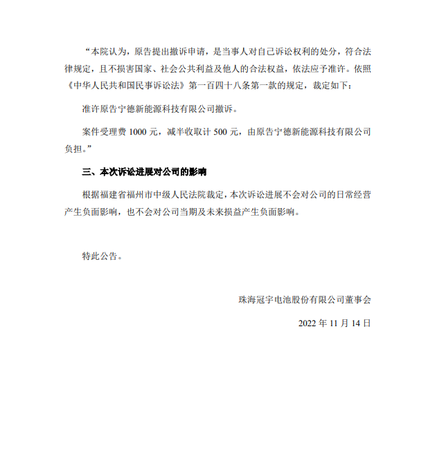 11月13日,珠海冠宇公告称,近日收到福建省福州市中级人民法院出具的《民事裁定书》。