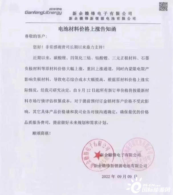 在这份9月9日向客户发出的告知函中,其表示,“近期以来,碳酸锂、四氧化三钴、钴酸锂、三元正极材料、石墨负极材料等原材料价格大幅上涨,同时内蒙古限电限产影响负极材料,导致电芯综合成本大幅提高。公司决定,自9月12日起所有新订单价格将按最新材料市场行情评估核算成本,对于提前预付定金锁材客户价格不受此影响。”