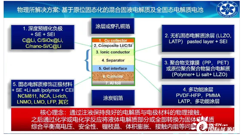 固态电池最大的问题是界面导电差,中国科学院物理研究所研究员李泓介绍,固态电池的难点是在膨胀过程中,固态电解质怎么能与正负极颗粒保持很好的接触,最好的状态是原子级别。他的团队采取的方法是基于原位固态化的混合固液电解质及全固态电解质电池,通过注液保持良好的电解质与电极材料的物理接触,之后通过化学或电化学反应将液体电解质部分或全部转换为固体电解质,综合平衡高电压、安全性、锂枝晶、体积膨胀、接触内阻等问题解决。