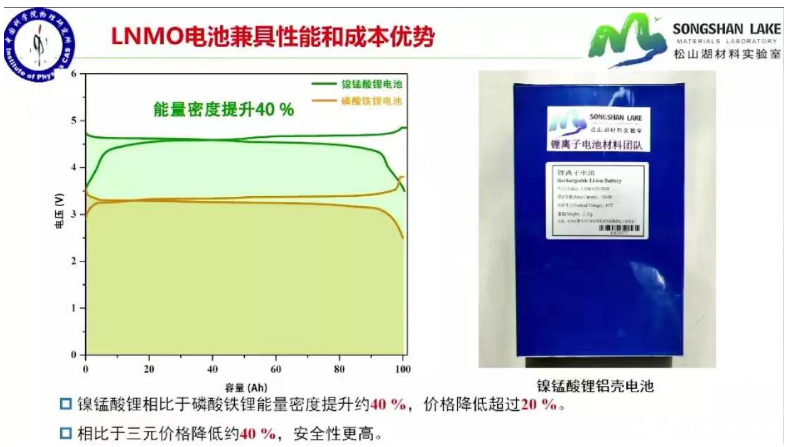 如此一来,镍锰酸锂的优点就很明显了,如果把磷酸铁锂电池做一下改进:负极不改变,电解液基本不改变,外壳也不变,仅仅改变的是正极材料。镍锰酸锂的密度比较高,同样能做到100Ah,但是电压提升了40.6%,单位体积能量提升了40%,成本上每一瓦时反而有20%的降低。这就是去钴降镍的的效果。