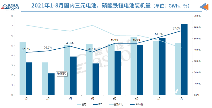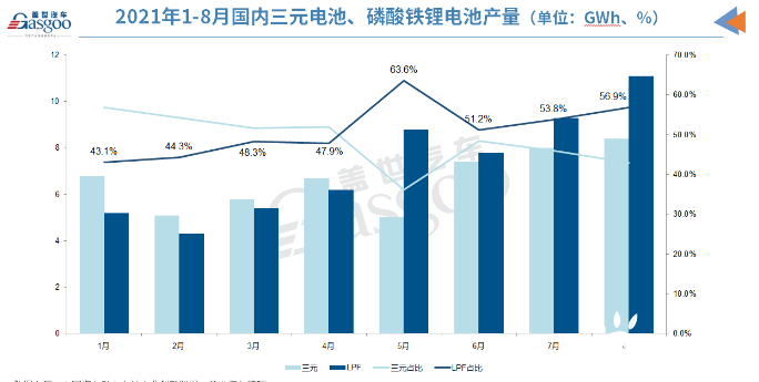 直到8月,磷酸铁锂电池连续第四个月产量超过三元电池,且二者的差距在进一步放大,市场占有率分别为56.9%和42.9%。至此,磷酸铁锂电池市场份额已经超过三元电池近14个百分点。