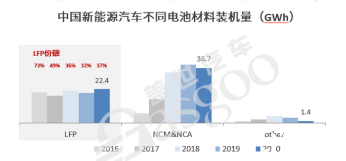 此后,随着搭载三元锂电池的新能源乘用车的快速崛起,三元锂电池的市占率从2016年的27%飙升至2019年的65%,磷酸铁锂电池则一路开始走低至2019年的32%。不过,这一局面在2020年出现了反转的苗头。