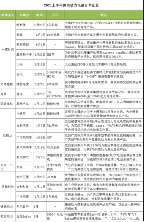 以下为2021上半年动力电池订单汇总:
