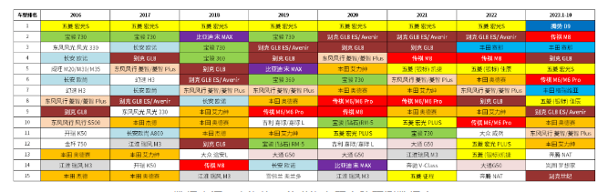 从近8年MPV品牌和车型销量TOP15排名来看,传统自主五菱凭借宏光S在2022年及以前一直高居榜首,但销量规模从2016年的67万萎缩到2022年的16万,2023年销量继续下滑,1-10月累计销量仅为7.4万辆,失去销冠头衔,排名跌至第五。