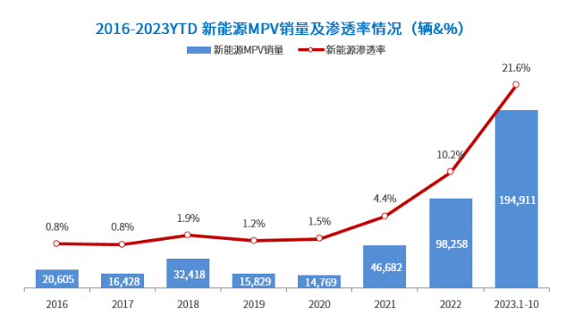2021年以前,MPV领域的新能源渗透率一直在2%以下;2021年新能源MPV销售了4.7万辆,渗透率提升至4.4%。2022年开始新能源MPV快速渗透,销售了9.8万辆,渗透率攀升到10.2%;而2023年1-10月新能源MPV累计销售了19.5万辆,新能源渗透率高达21.6%。