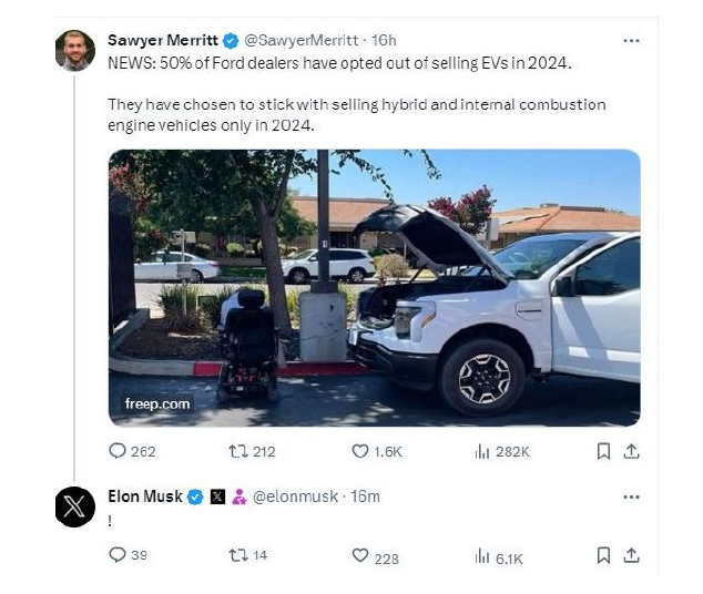 电动汽车分析师索耶·梅里特在X平台上分享了这一消息,马斯克回应了一个惊叹号。