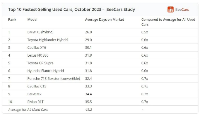 其中包括宝马X5第一名(销售时间26.8天)和丰田汉兰达混合动力第二名(销售时间29天)。
