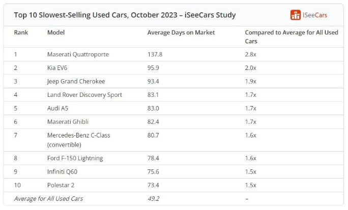 Brauer表示,当前最滞销的二手车大多是高级车型或电动汽车,玛莎拉蒂Quattroporte、起亚EV6和Jeep大切诺基的库存天数是二手车平均库存时间的两倍。
