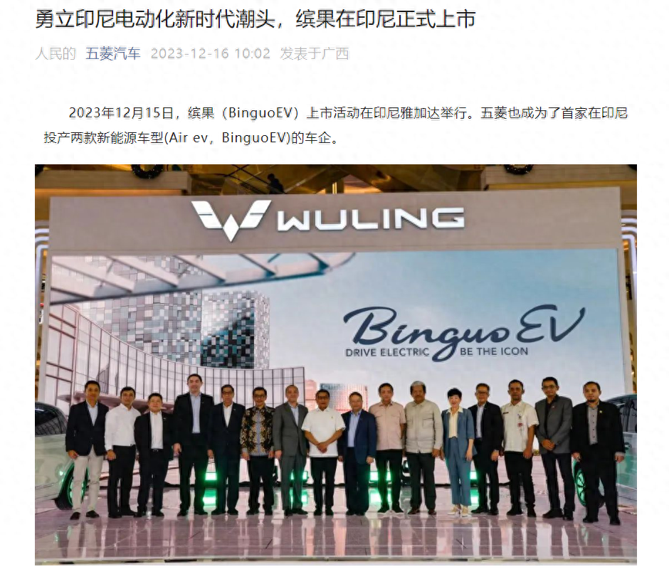 12月16日消息,五菱汽车宣布缤果(BinguoEV)在印尼上市,五菱成为了首家在印尼投产两款新能源车型(Air ev,BinguoEV)的车企。
