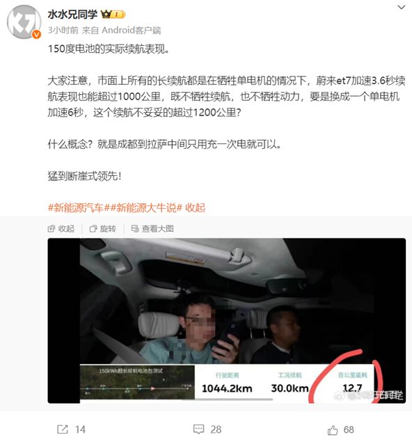 博主表示,市面上所有的长续航车型都是牺牲了个驱动电机而达成,但蔚来ET7 150度电池版,双电机零百加速3.6秒,续航表现也能超过1000公里,既不牺牲续航,也不牺牲动力。