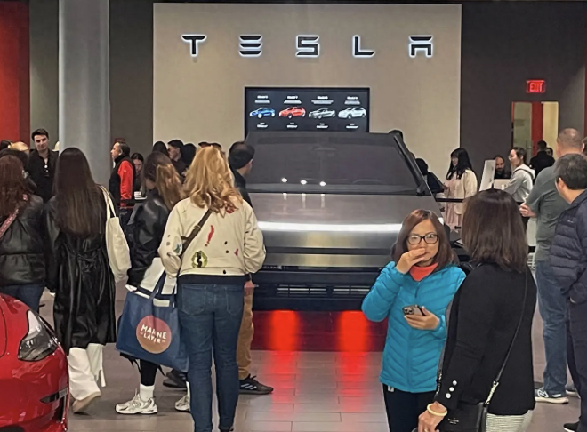 但是,不是所有人都觉得Cybertruck不好。一位50多岁顾客表示,他在4年前就预订了一辆。最近他收到了购车的邀请,并额外支付了250美元费用。他选择了高端的Cyberbeast型号。他第一次来看Cybertruck,说实车看起来更好。“与原型车相比,他们稍微缩小了它的尺寸,更紧凑了。”他说。他的妻子站在他旁边,说喜欢这个外观,尽管不如她丈夫那样着迷。