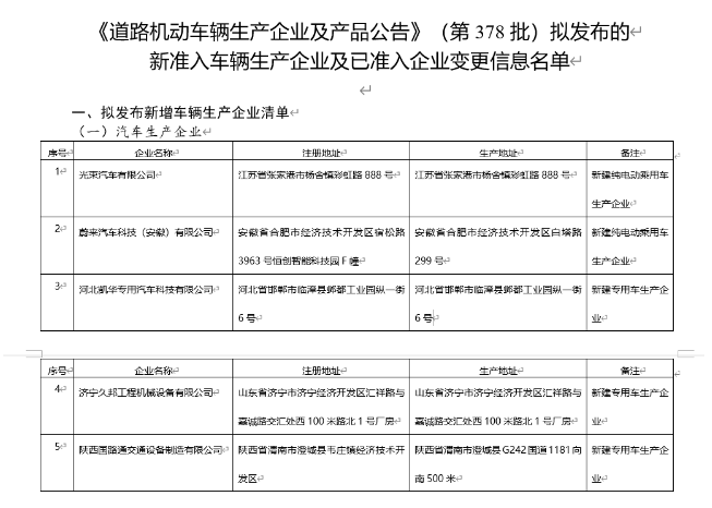 工信部最新公示的《道路机动车辆生产企业及产品公告》(第 378 批)拟发布新增车辆生产企业清单中出现了“光束汽车有限公司”以及“蔚来汽车科技(安徽)有限公司”两家企业,备注均为“新建纯电动乘用车生产企业”。