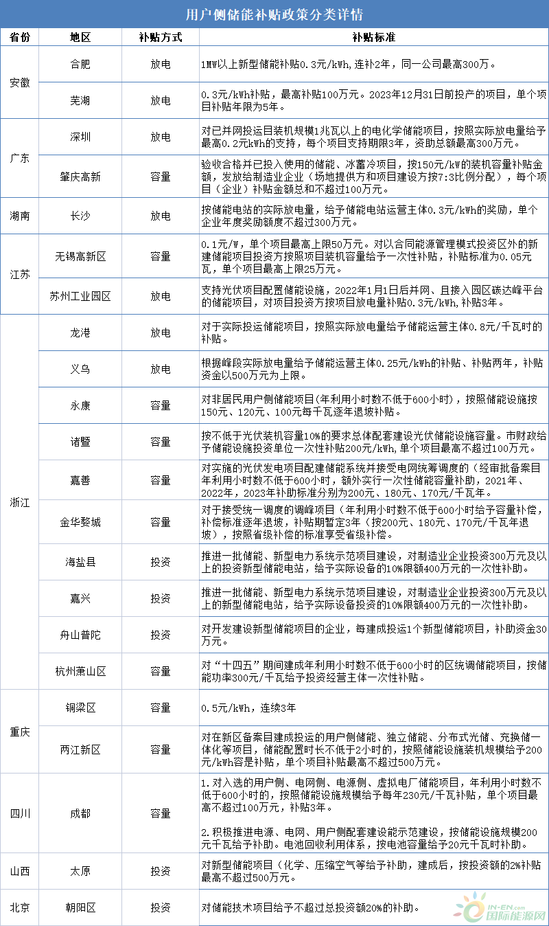 在补贴方面,浙江、江苏、四川、安徽、广东等地用户侧储能项目补贴政策最为密集,浙江省龙港市、北京市、重庆市铜梁区等地则补贴力度较大。