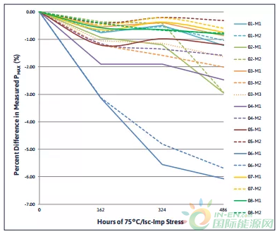 5. 重复步骤3两次以上,总试验时间达到486小时(相当于塞浦路斯户外1.6年实证)。每162小时测试一次性能。