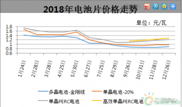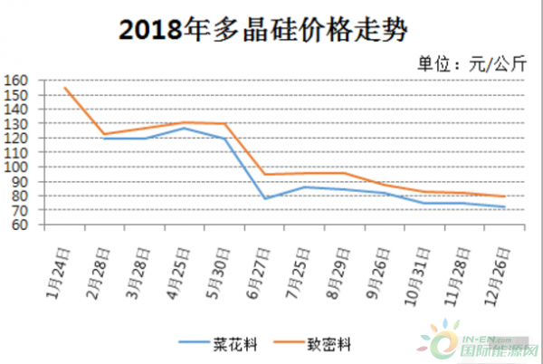 从PV Infolink每周统计的供应链价格来看,国内多晶硅(致密料)价格从年初的155元/公斤降到年底的80元/公斤,降幅达48.4%;多晶硅片从4.3元/片降到2.06元/片,单晶硅片从5.1元/片降到3.05元/片,降幅分别为52.1%和40.2%;多晶电池从1.42元/W降到0.89元/W,单晶电池从1.68元/W降到0.98元/W,降幅分别为37.3%和41.7%;常规多晶组件从2.61元/W降到1.86元/W,常规单晶组件从2.64元/W降到1.93元/W,降幅分别为28.7%和26.9%。