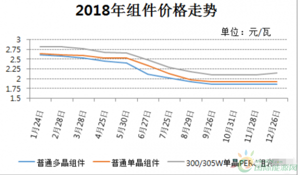 此外,组件价格的下跌从2018年几大集采招标报价中也可见一斑。在今年3月左右三峡新能源第一批组件集采中,高效单晶最低报价2.58元/W,普通单、多晶最低报价分别为2.53元/W和2.47元/W;5月份中能建下半年815MW组件集采中,高效单晶最低报价2.4元/W,普通单、多晶最低报价2.37元/W和2.33元/W;7月份国开新能源300MW高效领跑者组件集采开标,单晶PERC310W组件最低报价2.08元/W,均价2.27-2.28元/W;9月份北控第三批领跑者项目组件集采开标,双面双玻310W组件最低报价2.13元/W,均价2.21-2.22元/W;11月份中电建2019年1GW组件集采开标,多晶组件最低报价1.55元/W,均价1.72-1.74元/W,单晶组件最低报价1.72元/W,均价1.95-1.99元/W。