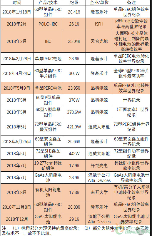 从技术研发来看,各种电池组件技术的效率纪录不断被刷新,如单晶PERC电池转换效率被多次刷新,目前最高效率为晶科能源保持的23.95%,打破了此前认为PERC电池效率无法突破23%的论断;再比如杭州纤纳光电的钙钛矿小组件效率突破17.9%,汉能子公司Alta Devices一年两破GaAs太阳能电池效率纪录,目前最高效率突破29.1%,为化合物太阳电池的发展提供了更多可能。下表为光伏們统计的2018年主要的一些效率纪录,如有遗漏欢迎留言补充。