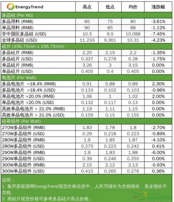 目前中国国内多晶用料价格在75~85RMB/KG,均价跌至80RMB/KG。单晶用料价格在85~90RMB/KG,均价跌至88RMB/KG。海外价格区间跌至9.5~10.5USD/KG,均价跌至10.09USD/KG。