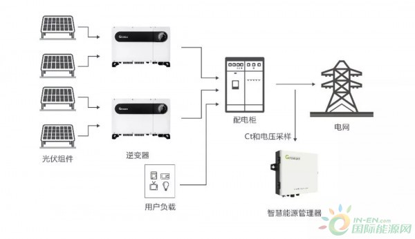 控制器与逆变器之间通过485进行通讯连接,单台最多可控制32台逆变器,通过CT与电压采样反馈至控制器智能电表,检测并网点PF值,PF值低了则说明无功成分大,从而控制逆变器进行无功输出,提高PF值。