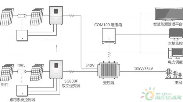 按照LCOE最低的系统设计原则, 推荐SG80BF采用2.5MW子阵容量。逆变器交流输出侧可以直接连变压器,省去交流汇流箱,同时集成跟踪系统双冗余供电以及通讯接口,采用PLC通讯,最大化降低系统投资,集成组件IV曲线在线扫描功能,快速定位发电异常组串,最大化提升系统收益。