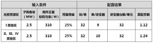 根据不同地区的光照资源区、不同地面反射情况产生的不同背面增益,系统设计方案有所不同。按照310W组件,背面增益设为25%,各类光照资源区的推荐接入方案如下表所示 。