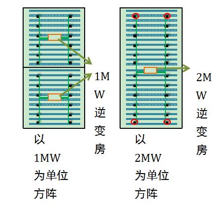另外,目前很多厂家主推的2MW方阵技术方案,即摒弃了传统的以1MW作为单位方阵,转而替之的以2MW作为单位方阵。2MW方阵方案相比1MW方阵方案,无论节约用地,节约初始投入成本来看都有优势。