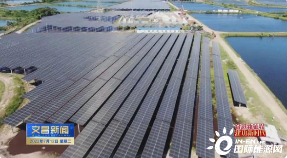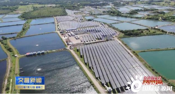 在海南华林文昌100MW农(渔)光互补项目光伏场区,只见一排排的太阳能板直直耸立在池塘上方,蓝色的光伏板在太阳的照射下闪闪发光.据了解,海南华林文昌100MW农(渔)光互补项目是海南省"十四五"首批并网的集中式平价光伏项目,项目总投资约6亿元,通过与村集体租赁土地的方式,流转利用现有鱼塘构建"水上光伏、水下养殖"的能源经济系统,实现光伏和渔业的垂直空间错位利用,在提高土地利用率的同时,极大提升了当地经济发展和生态环境.