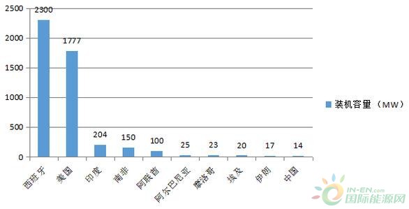 国际可再生能源署(IRENA)统计数据显示,截至2015年12月底,西班牙在运光热电站总装机容量为2300MW,占全球总装机容量近一半,位居世界第一;美国总装机量为1777MW,位列世界第二;两者合计光热装机超过4GW,约占全球光热装机的88%。其后是印度、南非、阿联酋、阿尔及利亚、摩洛哥等国。