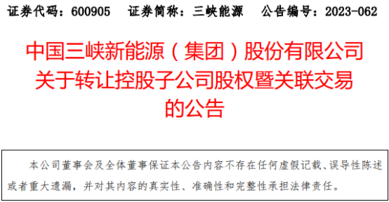日前,总市值约1300亿元的三峡能源发布了关于转让控股子公司股权和合资设立广西新公司的两则公告。