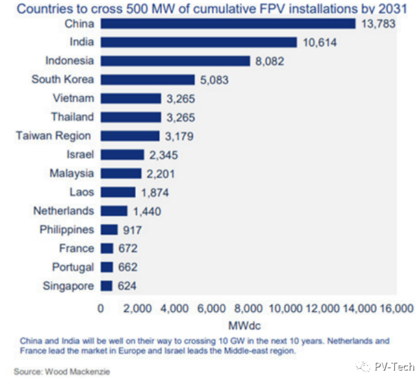 从地域上看,亚洲预计将引领FPV需求。至2031年,共有15个国家的FPV累计装机容量将超过500MW,其中11个国家位于亚洲。在这11个国家中,东南亚占了7个。